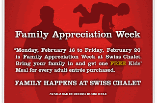Last night my family and I took advantage of this deal. We went to our local Swiss Chalet as a treat out with the money I earned from cupcake sales this week. My husband and I both ordered entrees, however he ordered a smaller meal than he would usually eat since we were getting a free kids meal with each entree and John is only 6 months so he didn't really eat his. John did nibble on a fry but daddy ate the bulk of his meal. John also got a Shirley Temple with his meal so mommy took care of that for him! Chloe had a quarter chicken dinner with a Zoo Juice. Quite generous! To complete the meal they were also given little treat bags which included some coupons, two magazines (a Lego catalogue and another magazine that I wouldn't recommend) along with treats (crispy minis, craisins, lypsol, bubble gum, goldfish and a mini Lindt chocolate bar). It really was quite a loot bag. We were also given a coupon book good through March and April.